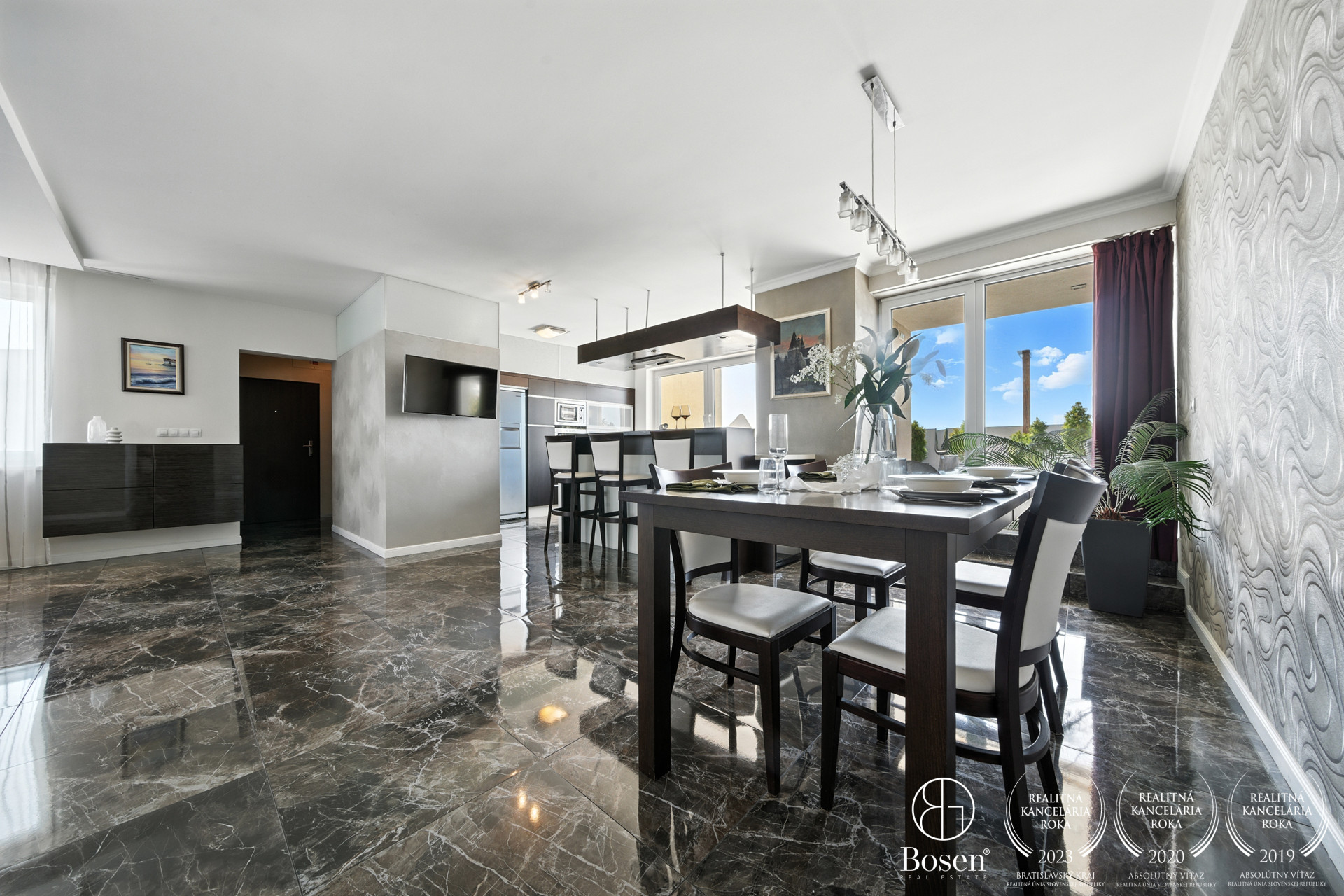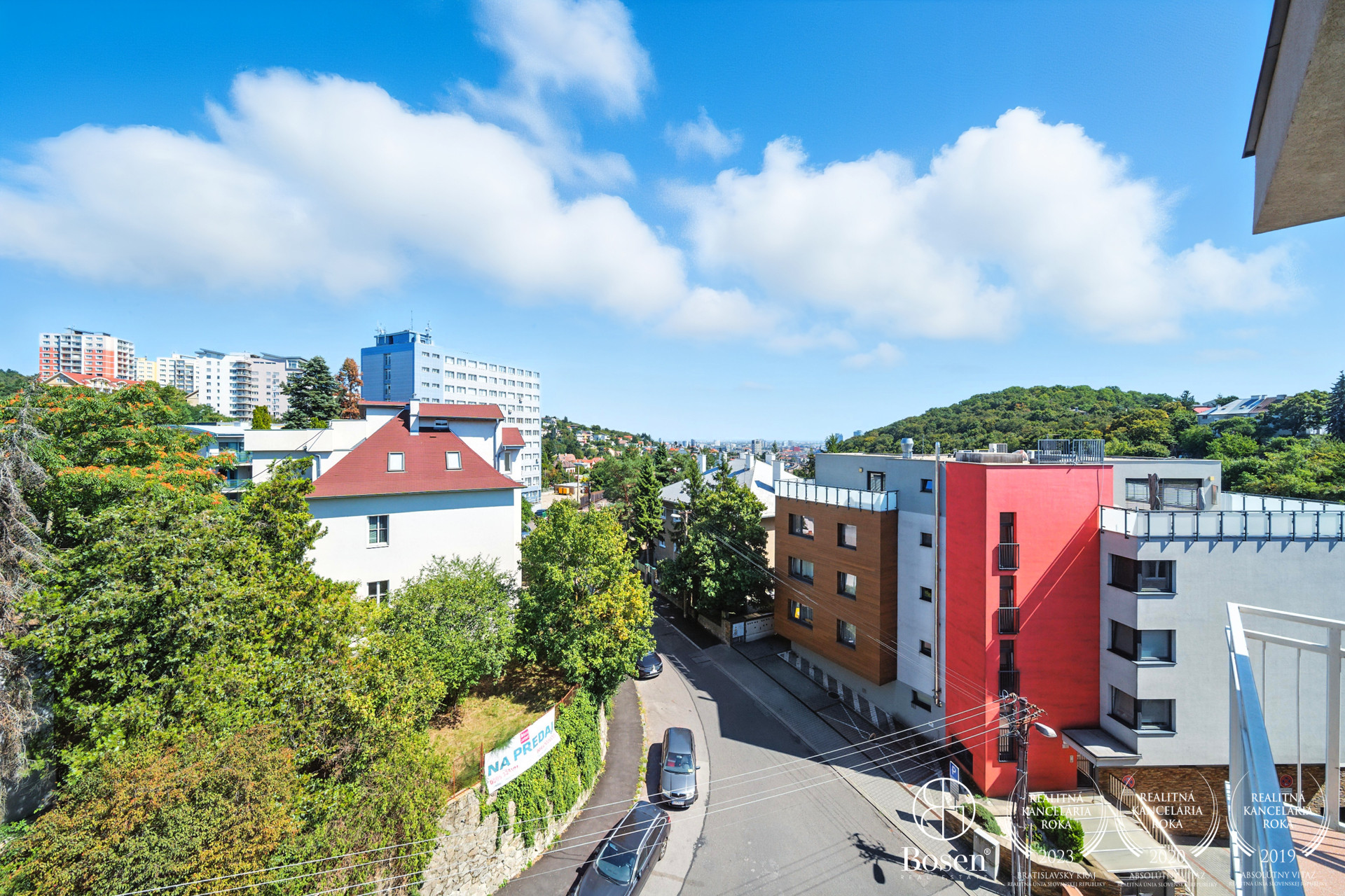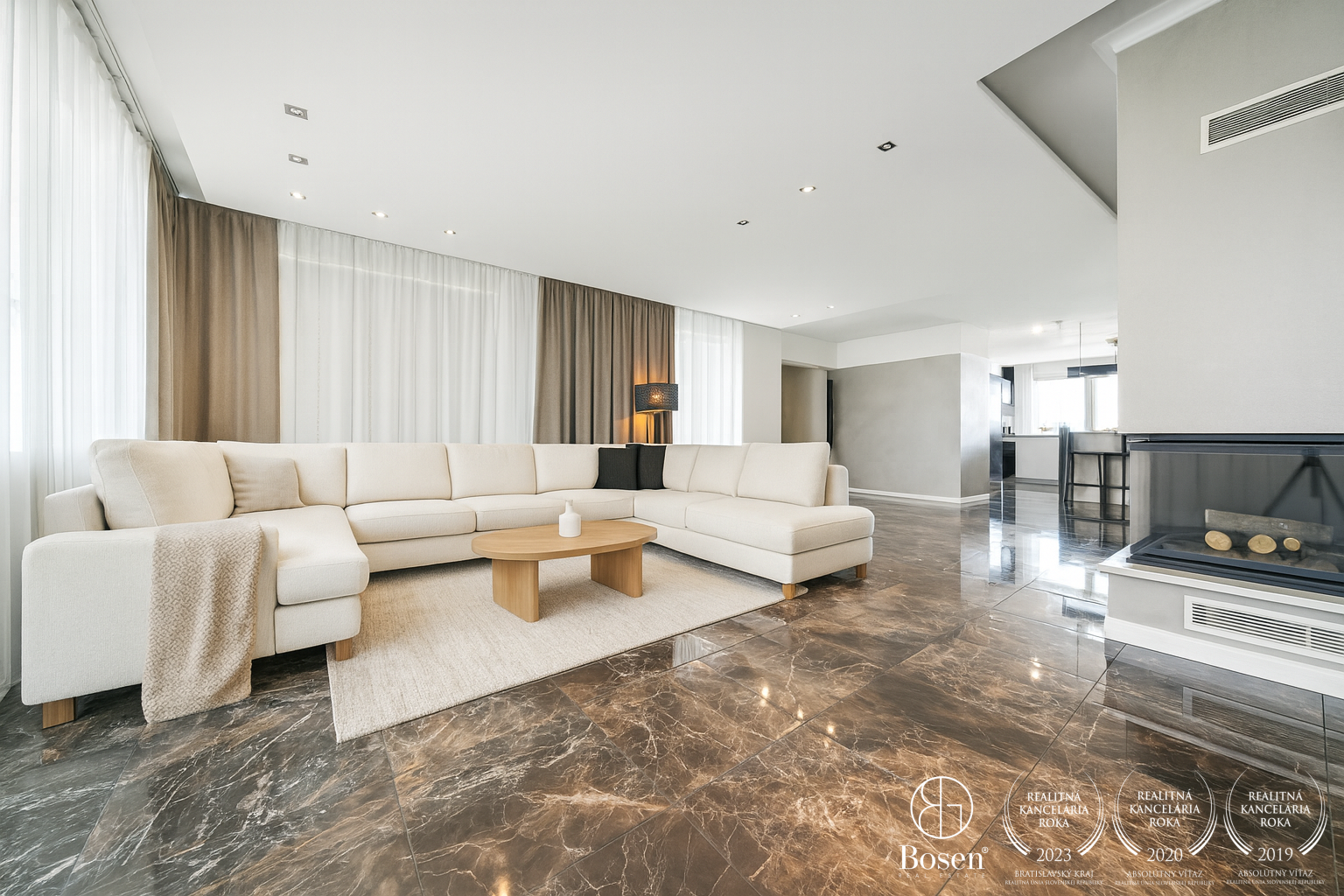 Bosen Group offers for sale a spacious 4-room penthouse apartment with a fireplace, two terraces, and beautiful views, situated in a quiet and popular part of Kramáre – on Uhrova Street. This exceptional apartment, with a floor area of 151.87 m² and an exterior space of 115.72 m², offers the perfect combination of privacy, generous space, and urban comfort.
