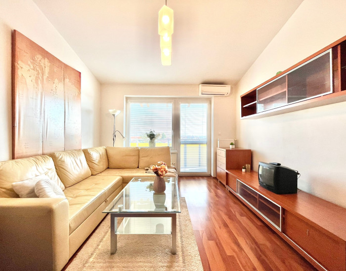 ZARIADENIE: Vo vstupnej chodbe sa nachádza veľká vstavaná rolldoorová skriňa s množstvom úložného priestoru. Kuchyňa je vybavená elektrickou varnou doskou, el. rúrou, chladničkou. Kuchynská časť je zakončená barovým pultom so sedením. V Obývacej časti sa nachádza veľká kožená rozkladacia pohovka s konferenčným stolíkom a obývacia stena. Priestranná kúpeľňa s dostatkom úložného priestoru spojená s WC je vybavená veľkou rohovou vaňou, práčkou. Byt má samostatne regulovateľné kúrenie a ohrev vody plynovým kotlom a klimatizáciu.
