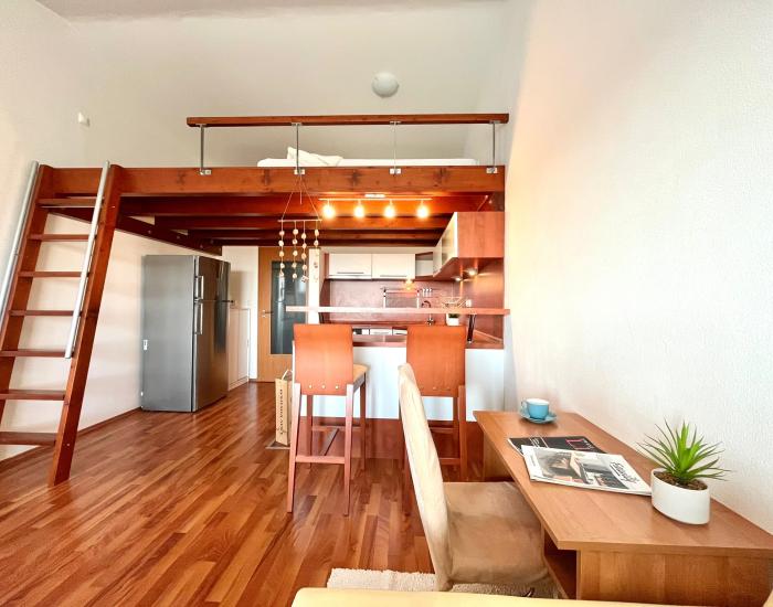 DISPOZÍCIA: Byt je rozdelený na obývaciu zónu, pracovnú zónu, kuchyňu a spaciu časť nad kuchyňou.