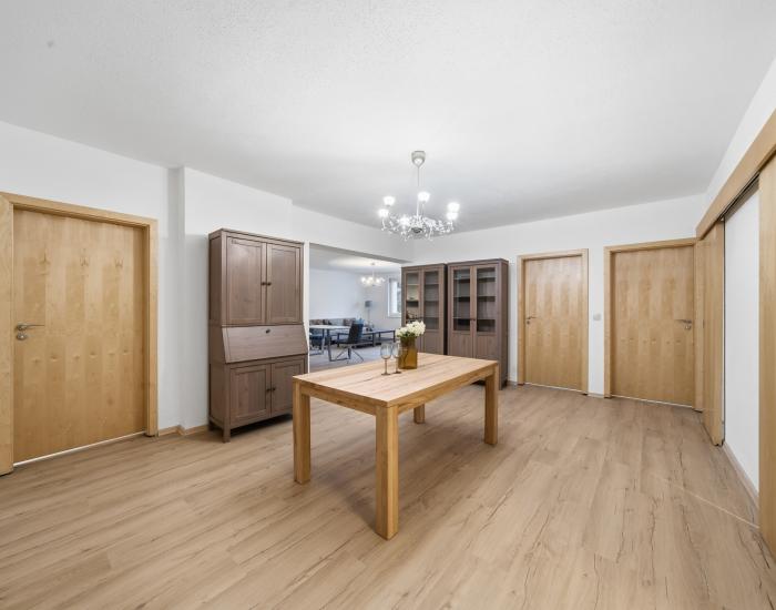 ZARIADENIE: Kuchyňa je vybavená chladničkou s mrazničkou, umývačkou riadu (XXL- 60cm), elektrickou rúrou , vstavanou mikrovlnkou, sklokeramickou indukčnou varnou doskou. Obývacia izba ponúka gauč, televízor a jedálenský stôl so stoličkami, ďalší jedálenský stôl je umiestnený vo vstupnej hale. Spálne a detská izba/pracovňa sú kompletne zariadené posteľami, komodami, skrinkami a pracovným stolom. V kúpeľni sa nachádza práčka. Ďalší televízor sa nachádza v spálni.