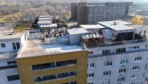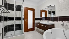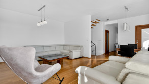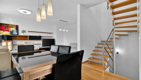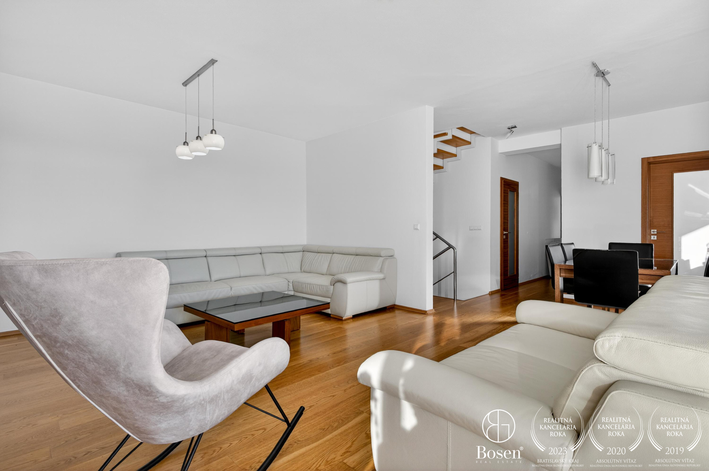 DISPOZÍCIA: Predsieň, z ktorej je vstup do kúpeľne s WC, dvoch izieb a na schodisko vedúce na poschodie. Na poschodí je obývačka s jedálňou, kuchyňa, WC a spálňa s kúpeľňou a šatníkom. Zo spálne a z obývačky je výstup na krytú terasu (35 m2). Schodiskom o poschodie vyššie sa dostaneme do malej kuchynky, zimnej záhrady (28 m2) a na strešnú terasu (160 m2).