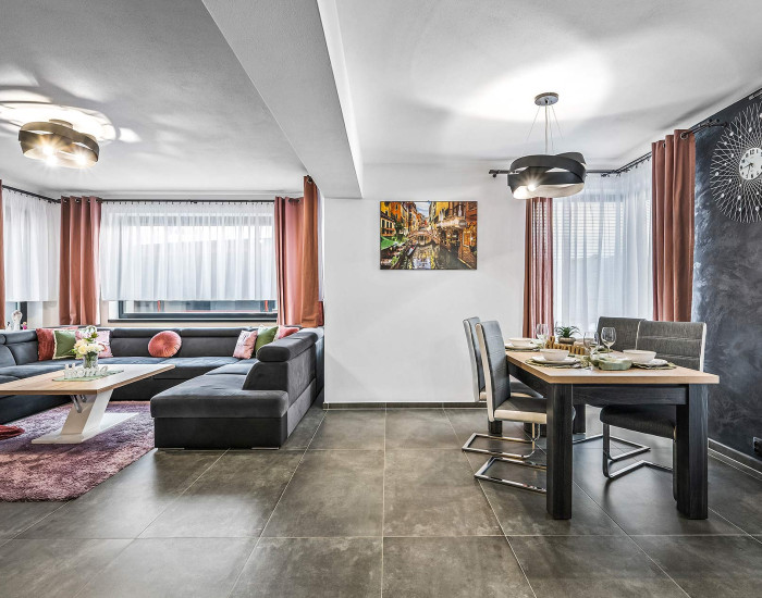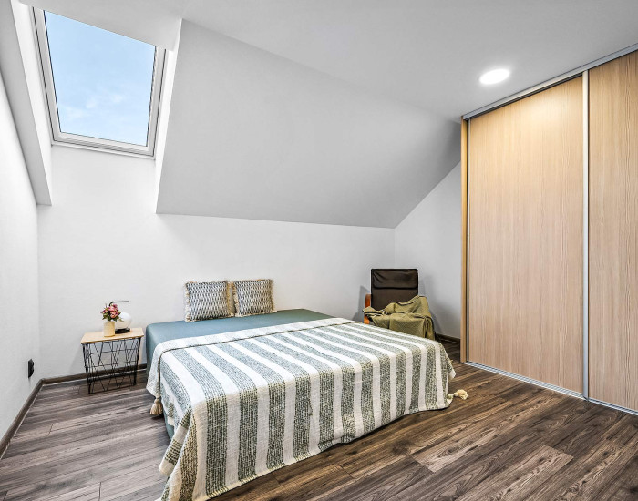 Rodinný dom: je postavený v nadčasovom štýle, disponuje krbom na tuhé palivo, dvoma garážami a 4 izbami, ktoré poskytujú komfortné bývanie aj pre väčšiu rodinu. Denná časť je výborne prepojená – priestranná obývacia izba, jedáleň a kuchyňa tvoria harmonický a svetlý priestor s výstupom na pozemok.