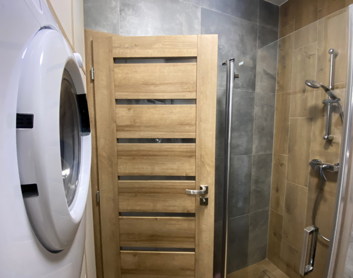 VYBAVENIE: Garsónka je plne zariadená a okamžite pripravená na nasťahovanie. Jej vybavenie zahŕňa: rozkladaciu pohovku, ktorá slúži aj ako pohodlné lôžko, jedálenský stôl so stoličkami, množstvo úložného priestoru v podobe skríň vyrábaných na mieru, práčku a sušičku, sklokeramickú indukčnú varnú dosku, kombinovanú rúru a mikrovlnku, chladničku s mrazničkou, TV, dokonca aj kávovar. V letných mesiacoch je pre nájomníkov k dispozícii aj vonkajšia vírivka, ideálna na relax počas teplých večerov.