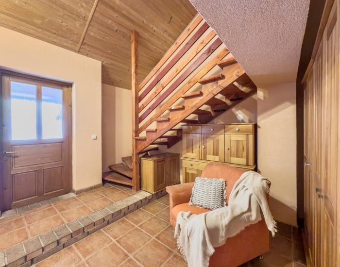 DISPOZÍCIA: Chata je dispozične rozdelená na dennú časť na prízemí a nočnú časť na poschodí. Prízemie tvorí predsieň, priestranná obývacia izba spojená s kuchyňou, jedáleň, kúpeľňa s toaletou, technická miestnosť a výstup na terasu. Na poschodie vedú drevené schody, kde sa nachádzajú dve samostatné spálne. Izby sú vybavené, ktorú oceníte najmä v letnom období.