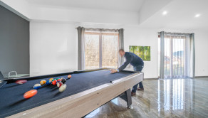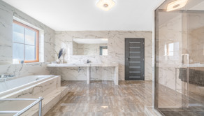 Obývacia izba s jedálenským priestorom očarí krbom, otvoreným stropom a impozantnou galériou, ktorá dodáva interiéru jedinečný architektonický charakter. Súčasťou prízemia je aj spálňa, elegantná kúpeľňa so sprchovým kútom a vaňou, samostatné WC a oddychová miestnosť s prípravou na vytvorenie súkromného wellness – jacuzzi alebo vírivky – s výhľadom do záhrady.