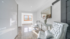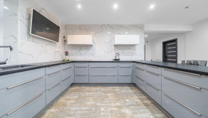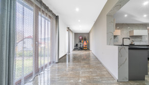 Prízemie domu vás privíta priestrannou vstupnou halou, ktorá plynulo prechádza do luxusnej kuchyne vybavenej prémiovými spotrebičmi značky Bosch. Kuchyňa je navrhnutá ako srdce domova – ideálna pre rodinné stretnutia aj spoločenské večery.