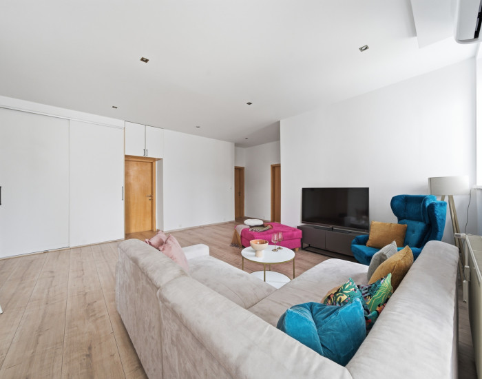BYT: Výmera bytu je 108 m² + balkón a pivnica. Byt sa nachádza na 2./4.poschodí s výťahom.