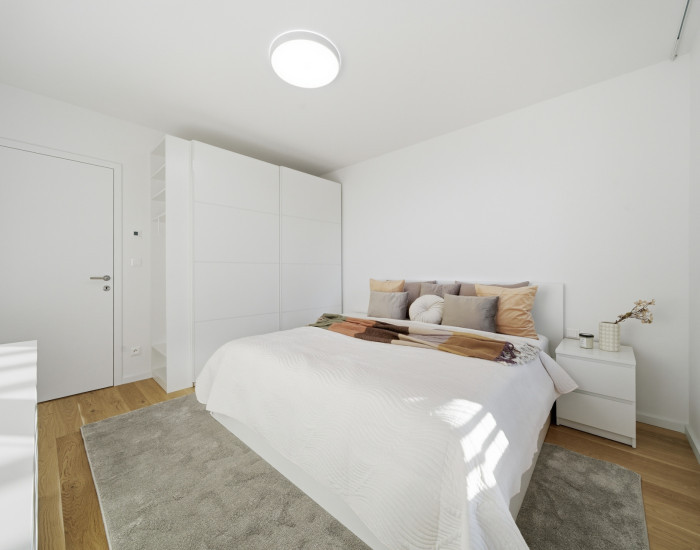 DISPOZÍCIA: Vstupná chodba, walk-in šatník, východne orientovaná obývacia izba s kuchyňou odkiaľ je vstup na balkón, izba, samostatná toaleta, kúpeľňa s vaňou a západne orientovaná spálňa.