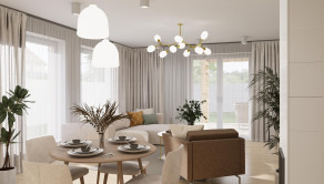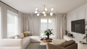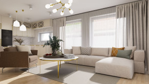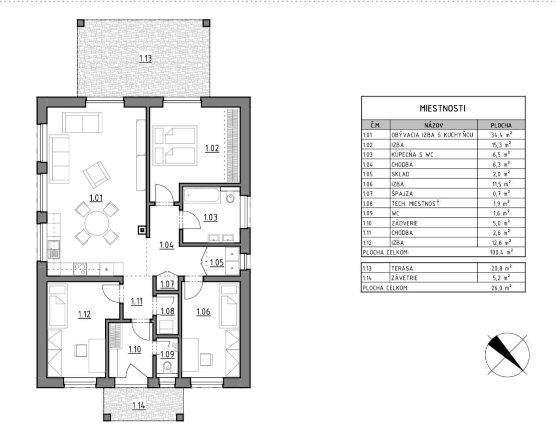 Rodinný dom má premyslenú 4-izbovú dispozíciu s úžitkovou plochou 100,4 m². Dennú časť tvorí priestranná obývacia izba s kuchyňou o výmere 34,4 m², ktorá je vďaka veľkým francúzskym oknám výborne presvetlená a plynulo prepojená s terasou o výmere 20,8 m².