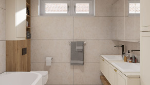 Nočná časť pozostáva z troch samostatných izieb s výmerami 15,3 m², 12,6 m² a 11,5 m². Dom disponuje jednou kúpeľňou s WC (6,5 m²) a zároveň samostatným WC (1,6 m²). Komfort bývania dopĺňajú špajza 0,7 m², technická miestnosť 1,9 m², sklad 2,0 m², zádverie 5,0 m² a chodby 6,3 m² a 2,6 m².