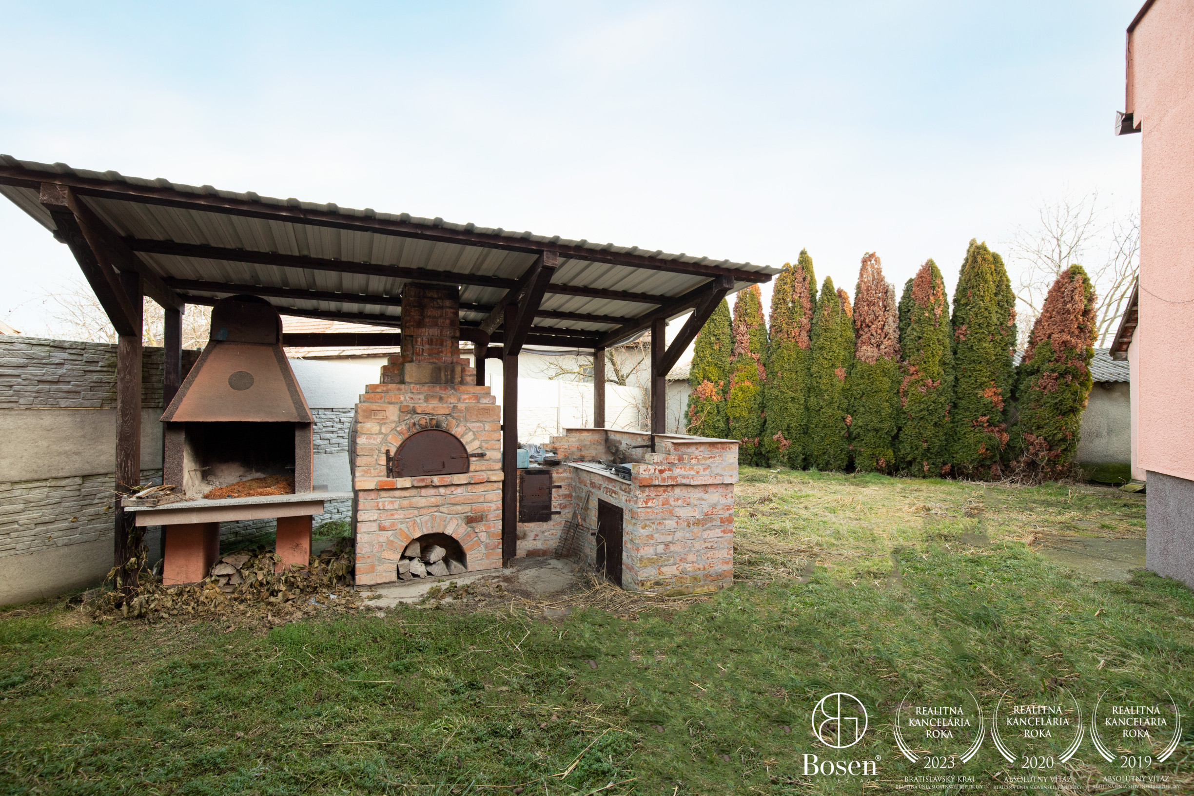 Na pozemku sa nachádza veľká krytá terasa, vonkajší krb, gril a kryté sedenie. Súčasťou nehnuteľnosti je aj vedľajšia budova o výmere cca 45 m², vhodná ako dielňa, sklad, hobby priestor alebo ateliér.