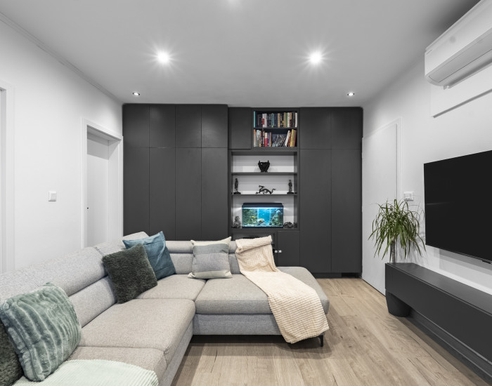 APARTMENT: The total area of the apartment is 60.27 m², of which the storage room (cellar) is 1.64 m² and the loggias total 10.29 m². The interior has undergone a complete and thorough renovation, including new electrical, water, and waste installations. The apartment is furnished with custom-made furniture with an emphasis on functionality, clean lines, and efficient use of space. The entire space feels harmonious and modern and is ready for immediate move-in. The living room is equipped with air conditioning, which not only cools the apartment but also serves as an air purifier for the entire area.