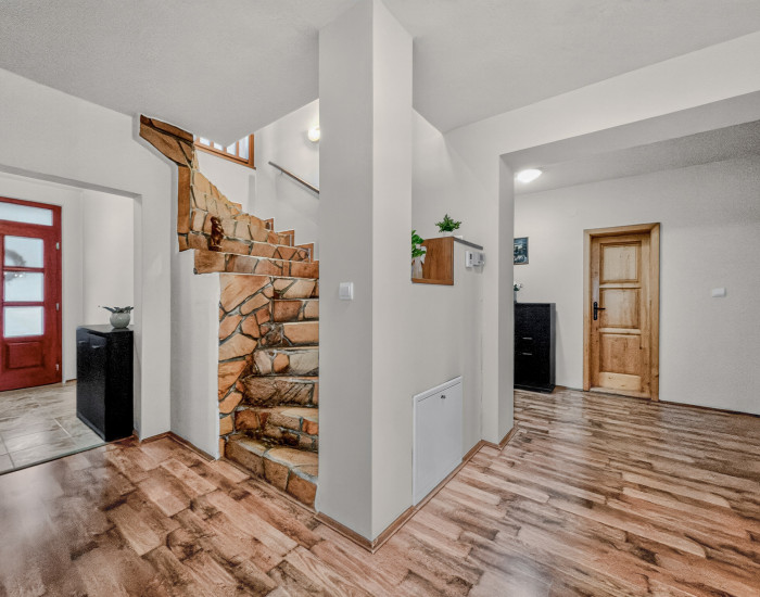 DISPOZÍCIA: Rodinný dom je dispozične veľmi dobre riešený – praktický, útulný a premyslený. Denná časť sa nachádza na prízemí a nočná čast na poschodí, kde sú vkusne vytvorené podkrovné izby s najväčším komfortom. Dom je čiastočne podpivničený - v suteréne sa nachádzajú dve miestnosti s celkovou rozlohou 20 m2 v technická miestnost a skladový priestor.