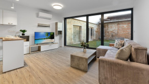 DISPOZÍCIA: Vstupná chodba, , presvetlená obývacia časť spojená s kuchyňou s výstupom na predzáhradku, kúpeľňa so sprchovým kútom a toaletou.