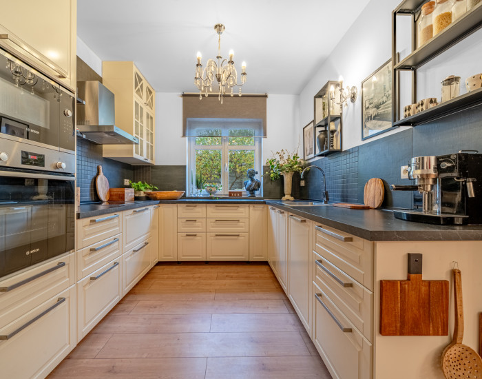 DISPOZÍCIA: Byt pozostáva zo vstupnej chodby, priestrannej obývacej izby prepojenej s jedálňou a kuchyňou. S obývacej izby je krásny výhľad na terasu a do záhrady. Nájdete tu rovnováhu medzi komfortom a tichom prírody. Ďalej spálňa s výhľadom do záhrady a priestranná pracovňa. Kúpeľňa so sprchovým kútom a samostatné WC.