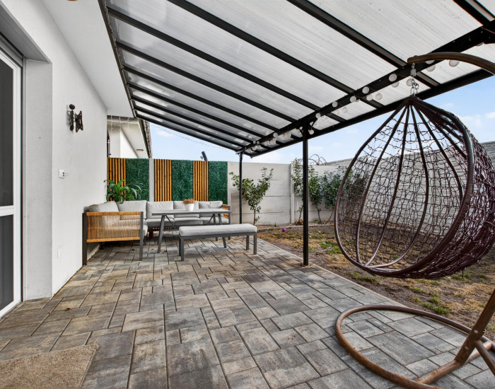 RODINNÝ DOM: Samostatne stojaci bungalov s jedným nadzemným podlažím. Novostavba kolaudovaná v roku 2022. Zastavaná plocha domu je 103,5 m2 a podlahová plocha domu je 80,94 m2. Rodinný dom je postavený klasickou murovanou technológiou z kvalitných stavebných materiálov. Základy domu sú tvorené betónovými základovými pásmi a železobetónovou doskou. Obvodové múry sú murované z tehál hr. 300 mm, zateplené polystyrénom 150 mm, strešná krytina- dvojdrážková škridla, celulózová (fúkaná) izolácia strechy, teplovodné plynové podlahové kúrenie, plynový kotol, plastové okná s izolačným 3 sklom, plastové vstupné dvere, vonkajšie elektrické rolety, klimatizácia, odkladací priestor na povale, oplotenie, krytá terasa – hliníková pergola s lexanovým prekrytím, 3 vonkajšie parkovacie státia. Rodinný dom je napojený na tieto inžinierske siete: elektrika, kanalizácia, voda, plyn.