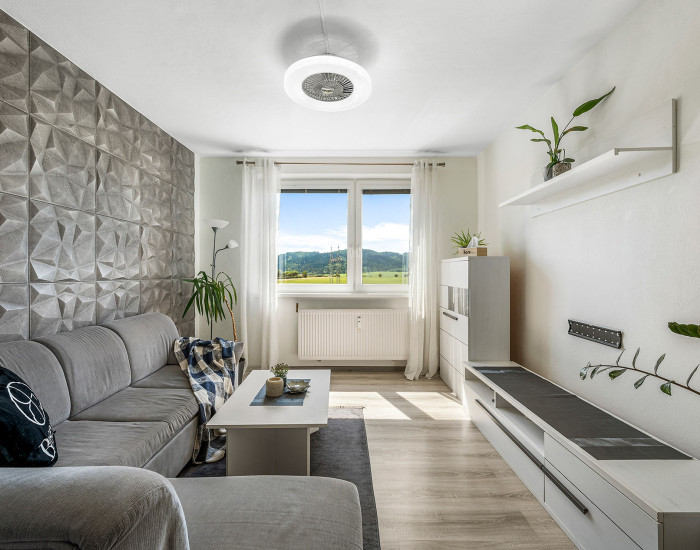 - kuchyňa kompletne zariadená spotrebičmi (chladnička, mikrovlnná rúra, elektrická rúra, plynový sporák) + jedálenský stôl a výstup na balkón s krásnym južným výhľadom na polia a lesy