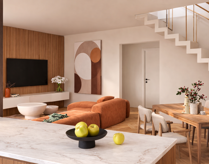Interiér – holodom - obvodové steny a priečky, dokončené všetky rozvody elektriky, vody, odpadu, tepelné čerpadlo, podlahové kúrenie, omietky, biela maľovka, predpríprava na exteriérové žaluzie.