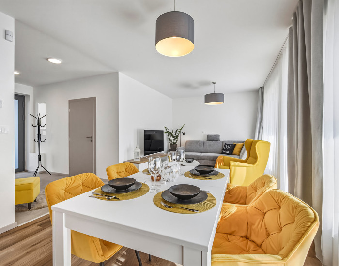 DISPOZÍCIA: Apartmán sa nachádza na prízemí apartmánového domu a ponúka praktické dispozičné riešenie s dôrazom na komfort a funkčnosť priestoru.