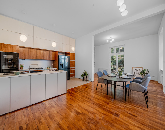 APARTMENT: With a total area of 130m2, it underwent a complete reconstruction in 2024 and is located on the 2nd floor of an apartment building. The apartment has an intelligent heating control system and is fully air-conditioned. The apartment also has a cellar that is large enough to store bicycles or a stroller. There is a front garden in the inner block that can be used for barbecues or activities with children.