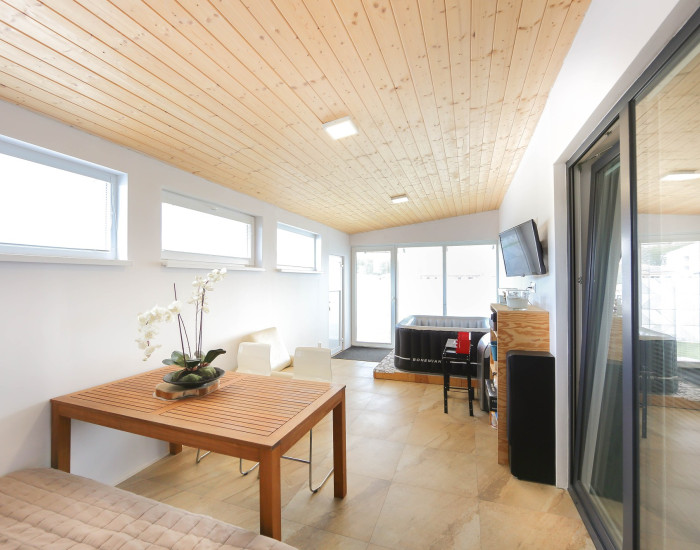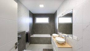 • Podlahy: V interiéri je zvolená nadčasová kombinácia prémiovej keramickej dlažby a kvalitnej vinylovej podlahy, čo zabezpečuje nielen vizuálnu atraktivitu, ale aj vysokú odolnosť a ideálne vedenie tepla z podlahového vykurovania.