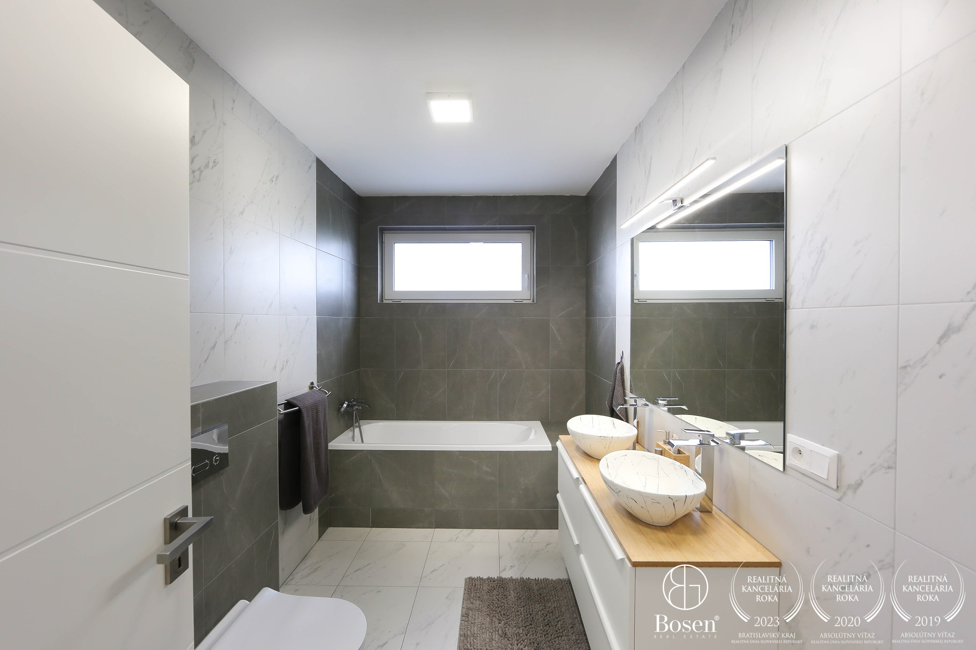 • Hlavná kúpeľňa: Disponuje vaňou, dvoma umývadlami pre vyšší ranný komfort a druhou toaletou.