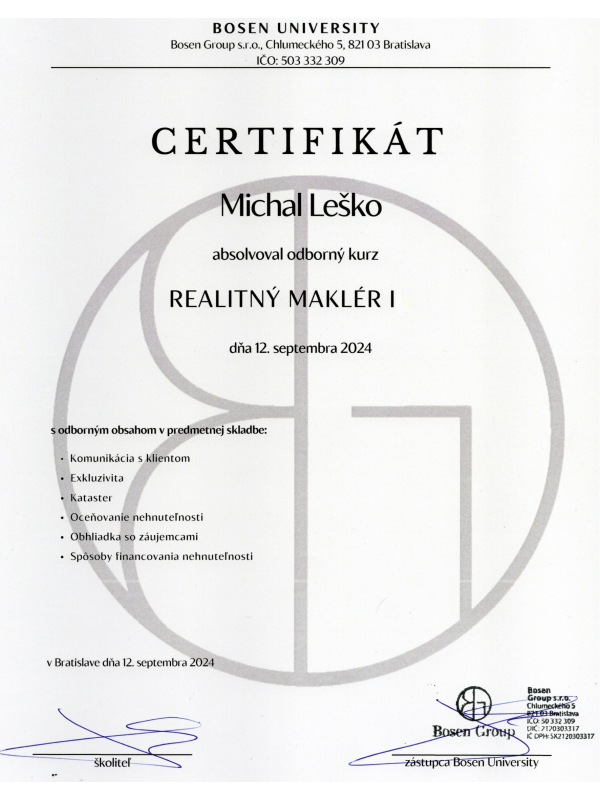Stať sa realitným maklérom mi behalo po rozume už dlhšie, z obdobia, keď som sa zaoberal predajom vlastnej nehnuteľnosti. Na niektoré momenty v živote si treba počkať a možno aj ,,dozrieť´´, preto som sa časom rozhodol stať maklérom, zastupovať spoločnosť BOSEN GROUP, ktorá má silné postavenie na realitnom trhu, dlhoročné skúsenosti a dobré meno.