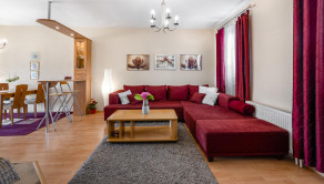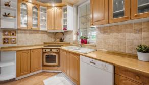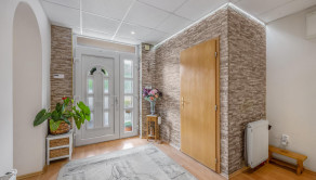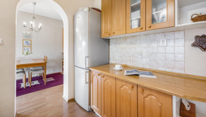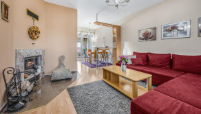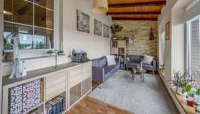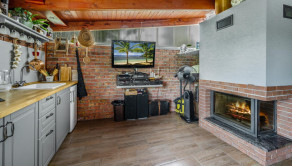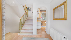 PRÍZEMIE: kuchyňa je prepojená s obývacou izbou a s jedálenskym kútom, z ktorého je výstup do zimnej záhrady s výhľadom na záhradu. V obývacej izbe sa nachdáza krb s výduchmi na horné poschodie. V stupnej chodbe sa nachádza samostatná toaleta.