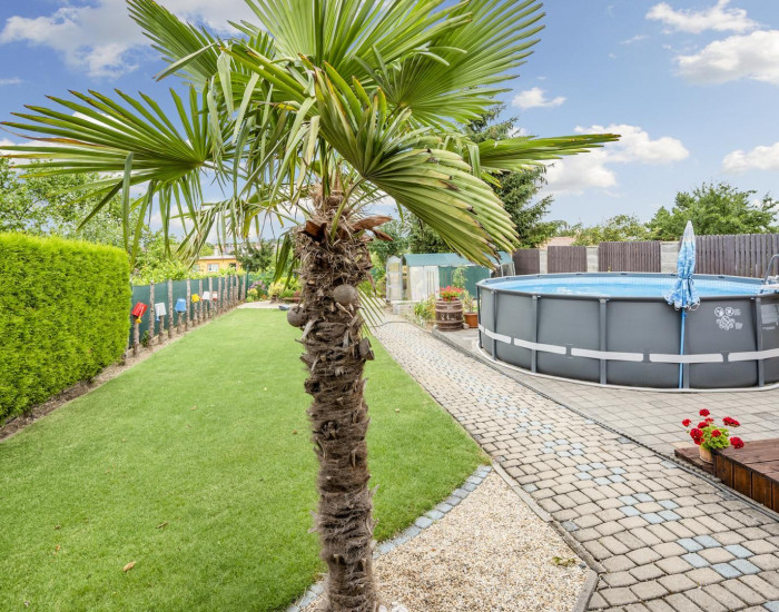 POZEMOK: Prevažne rovinatý pozemok o rozlohe 800m2 je upravený, nachádza sa na ňom nadzemný bazén a jazierko, garáž na dve autá spojená so zimnou záhradou, kuchyňou, krbom a vonkajšou terasou.