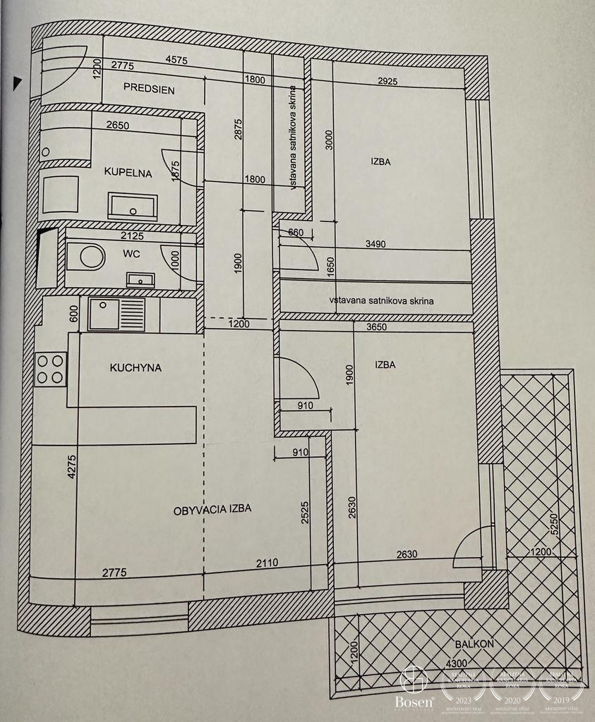 DISPOZÍCIA: Za vstupnými dverami sa nachádza vstupná chodba s úložným priestorom a vstupom do priestrannej kúpeľne so sprchovým kútom, do spálne a samostatnej toalety. Byt ďalej pozostáva z obývacej izby spojenej s kuchynskou časťou a z detskej izby s výstupom na balkón.