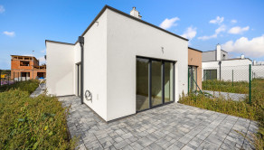 Dom: Novostavba, dokončenie 11/23 – dvojdom s rovnou strechou, 4 izbový, zastavaná plocha mezonet 60,75 m2, úžitková plocha mezonet 94 m2, zastavaná plocha bungalov 105,74 m2, úžitková plocha bungalov 84 m2, terasou zo zámkovej dlažby 15 m2, predpríprava na krb, chodník zo zámkovej dlažby od ulice k vchodovým dverám, chodník zo zámkovej dlažby od parkovacieho státia k vchodovým dverám, okapový chodník okolo celého domu vrátane štrkového zásypu, vonkajšie obvodové murivo tehla Wienerberger – hrúbka 30 cm, vnútorné priečky Pezinská tehla– hrúbka 11,5 cm, zateplenie obvodového muriva – 15 cm hrúbka polystyrénových dosiek, fasádna omietka – 1,5 cm hrúbka, interiérové sadrové omietky, 20+20 cm stropná izolácia minerálnou vlnou, plastové okná a balkónové dvere 6 komorové – 3 sklo, bezpečnostné vchodové dvere so sklenenou výplňou, teplovodné kúrenie, 2x5 cm podlahová izolácia, tepelné čerpadlo, zásuvky + vypínače, elektrická poistná skrinka, optické a dátové káble, elektrická predpríprava na alarm, elektrická predpríprava na studňu a závlahu, zabudované rozvody na klimatizáciu v obývačke, predpríprava na vonkajšie elektrické žalúzie