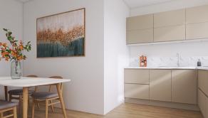 DISPOZÍCIA: Byt pozostáva z predsiene, detskej izby, spální, z priestrannej izby vrátane izieb, ktorá umožňuje časť s kuchyňou a toaletou s prístupom z predsiene.