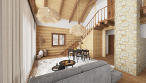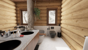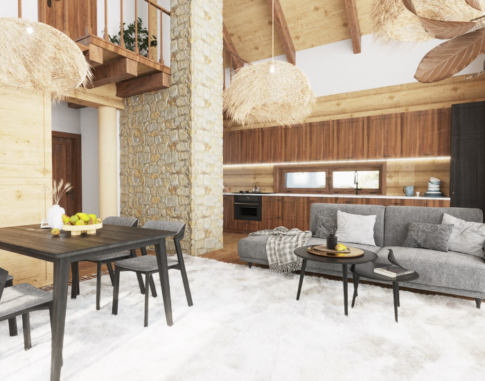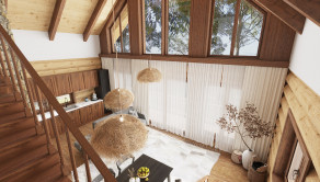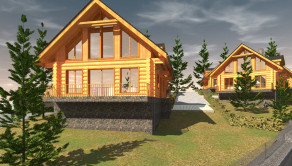 DISPOZÍCIA: Na prízemí zrubu sa nachádza vstupná hala s chodbou a hosťovským WC, izbu (15,54 m2) so šatníkom a vlastnou kúpeľňou s vaňou. Komfortná denná časť ponúka na ploche (42,38 m2) obývačku s jedálenskou časťou a kuchynským kútom. Denná časť komunikuje cez presklené plochy s exteriérom a terasou (12,3 m2), ktorá v letných mesiacom bude hrať dominantnú úlohu vo vašom pobyte. Poschodie ponúka galériu so vstupom do dvoch izieb (11,59 m2) so spoločnou kúpeľňou s vaňou a WC. Po dohode je možné galériu uzatvoriť a dorobiť jednu alebo dve izby na podlaží podľa požiadavky.