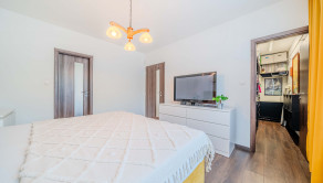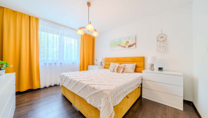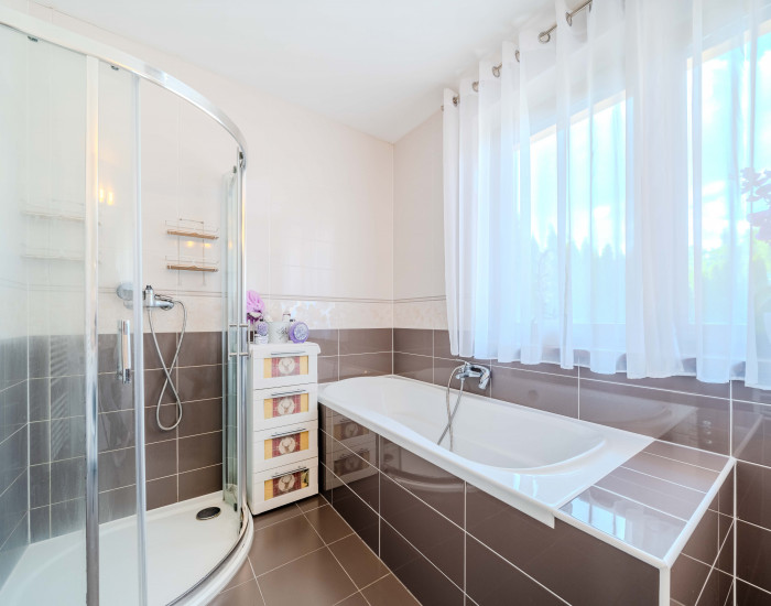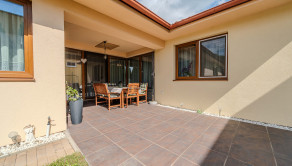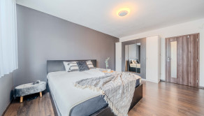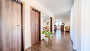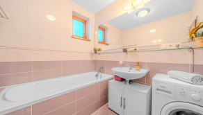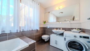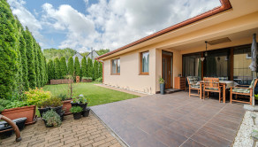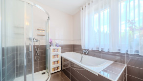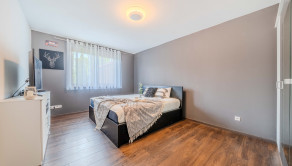 DISPOZÍCIA: Hlavný vstup do domu vedie cez uzatvárateľné zádverie. Pri vstupe sa nachádzajú dve identické izby, každá o rozlohe 17,65 m2. Na chodbe sa nachádza šatník, hosťovské WC, kúpeľňa s vaňou a technická miestnosť. Z chodby je zabezpečený výstup na terasu. Priestranná obývačka prepojená s jedálenským kútom a oddelenou kuchyňou poskytuje pohodlie na 44 m2. V zadnej časti domu sa nachádza hlavná spálňa so samostatnou kúpeľnou s vaňou, sprchovacím kútom, WC a šatníkom.