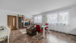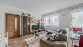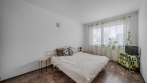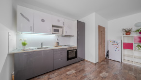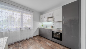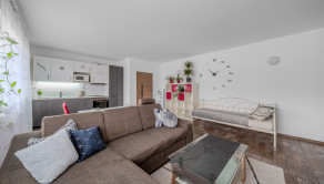 DISPOZÍCIA: Byt pozostáva zo vstupnej chodby, kúpeľne s toaletou a vaňou. Priestranná obývačka je spojená s uchyňou a jedálenskou časťou. Nepriechodná spálňa tak poskytuje dostatok súkromia. Vďaka veľkým oknám je byt presvetlený aj napriek tomu, že sa nachádza na prízemí.