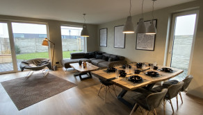 DOM: Zastavaná plocha je 108, 1 m2 s podlahovou plochou (Byt A-113 m2) a (Byt B-110 m2), predpokladaná kolaudácia je začiatkom 4Q. Dom je tehlový, zateplený s plechovou strechou. Predáva sa v stave holodom s možnosťou dokončenia do štandardu. Vybavenie: elektrické podlahové kúrenie s ovládaním v každej miestnosti, 5-komorové plastové okná, predpríprava na klimatizáciu, rekuperáciu, krb, externé žalúzie a bezpečnostný systém. Orientácia domu je na západnú stranu, čo znamená, že obývačka a spálňa je krásne presvetlená.