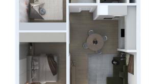 DISPOZÍCIA: Vstup do bytu tvorí chodba s priestorom na rolldor. Z chodby je vstup do kúpeľne s vaňou a samostnaným WC. Obývacia miestnosť je prepojená s kuchyňou a vstupom do spálne a detskej izby. Z obyvacej miestnosti aj zo spálne je vstup na priestranný balkón.