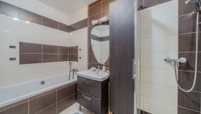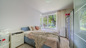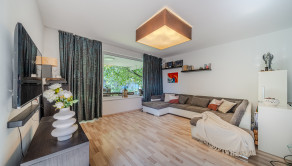 Byt pozostáva z priestrannej obývacej izby prepojenej s plne vybavenou kuchyňou vrátane zabudovaných spotrebičov. Z obývacej izby vedie vstup na slnečnú terasu, ktorá je prepojená s vlastnou súkromnou záhradou, ideálnou na relax či rodinné posedenia. Byt má dve samostatné izby, jedna využívaná ako detská izba, spálňa s výhľadom do záhrady, taktiež disponuje modernou kúpeľňou, vaňou, sprchou a toaletou.