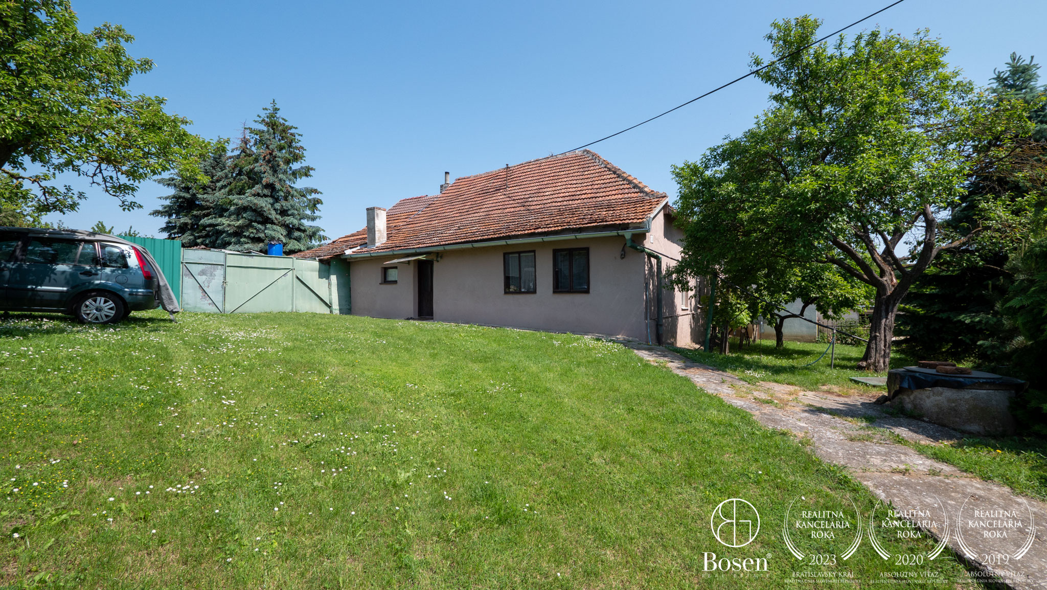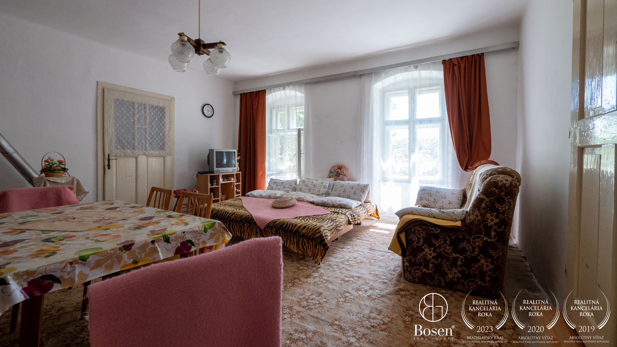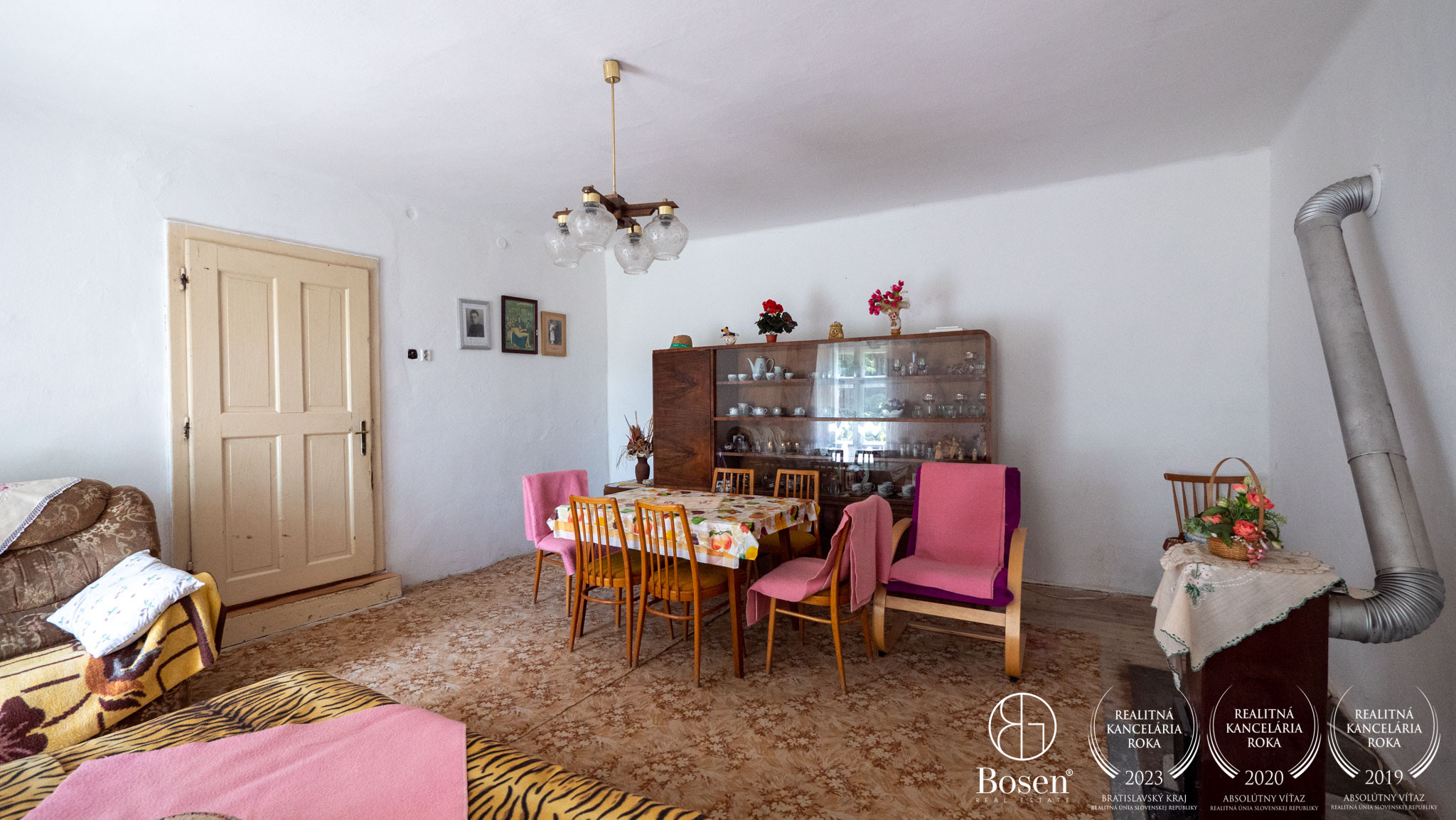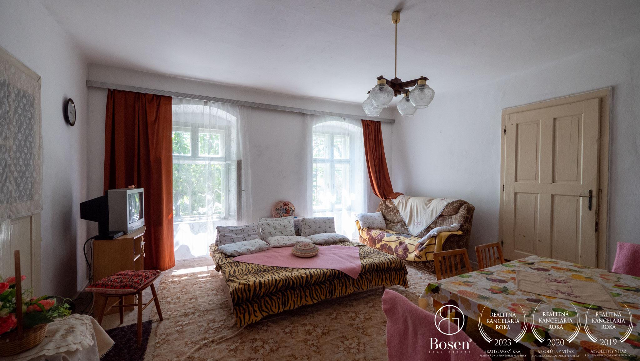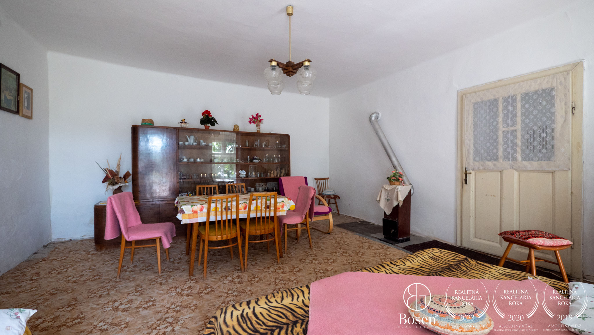 RODINNÝ DOM: pôvodný stav, podlahová plocha je cca. 90 m2, 2 izby, drevené parkety, drevené okná, plynové kúrenie (gamaty), piecka, suché WC, elektrická a plynová prípojka, studničná voda, možnosť obytného podkrovia.