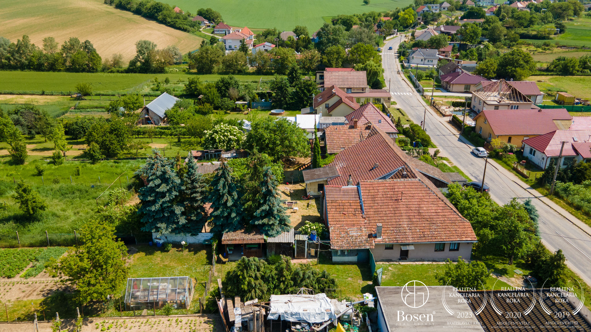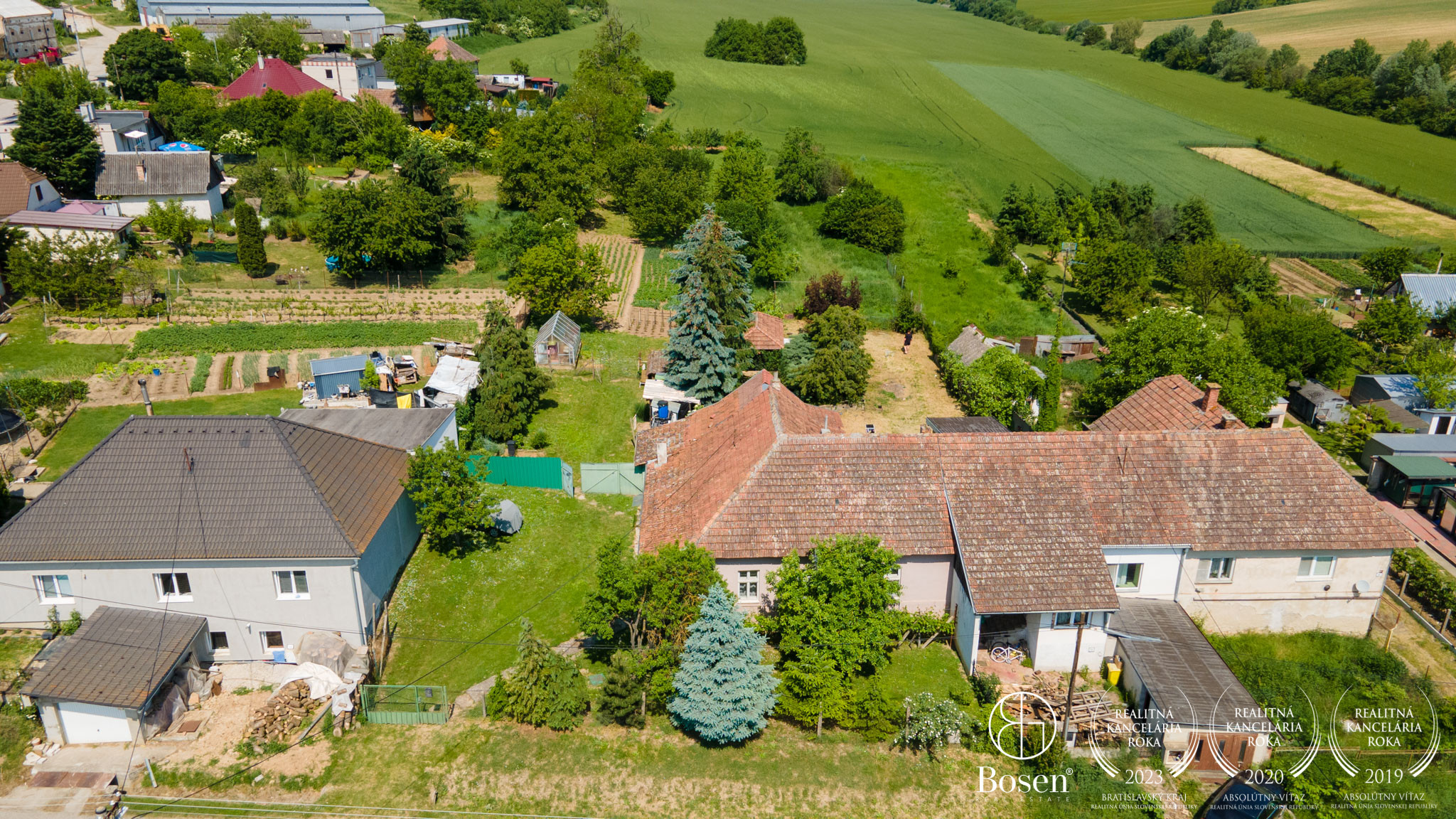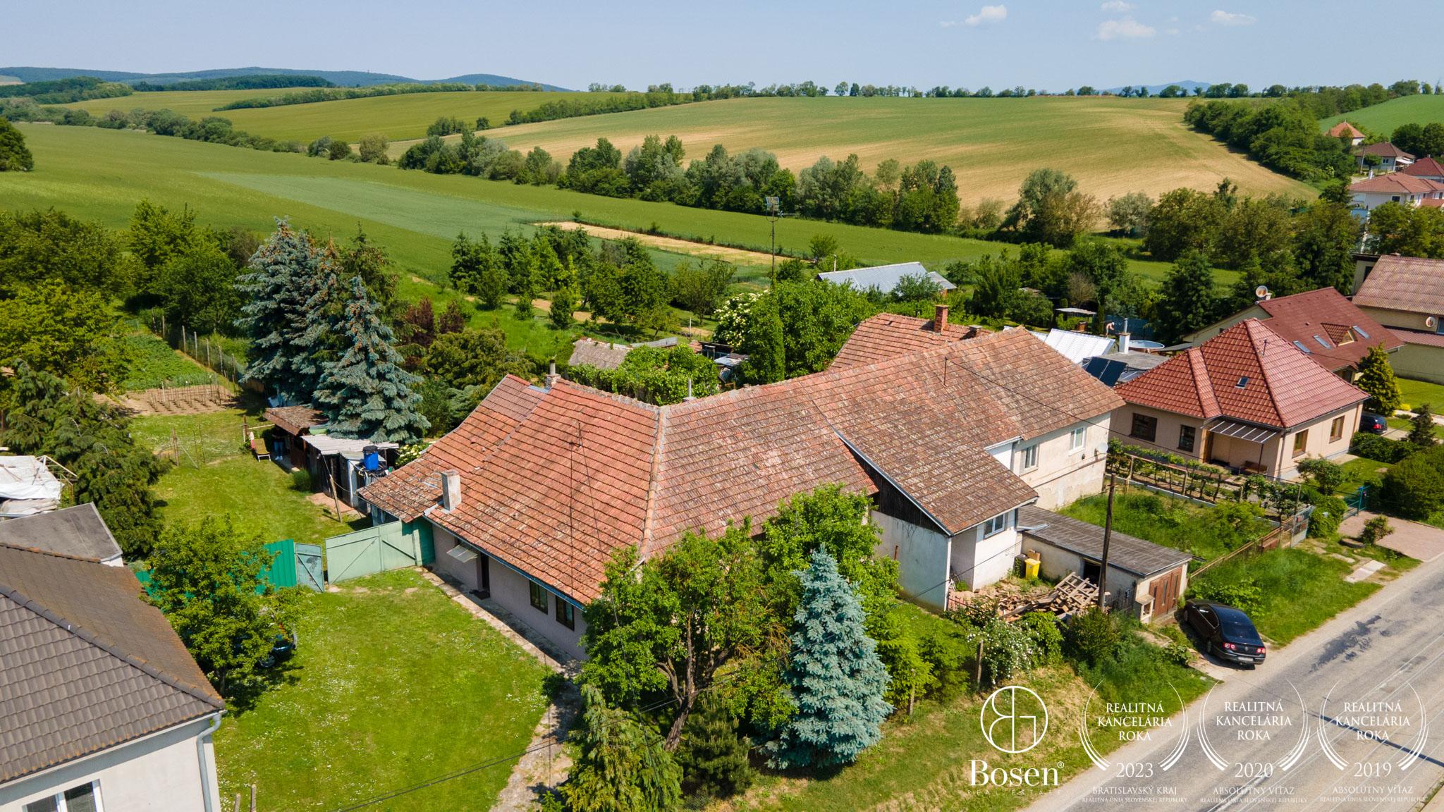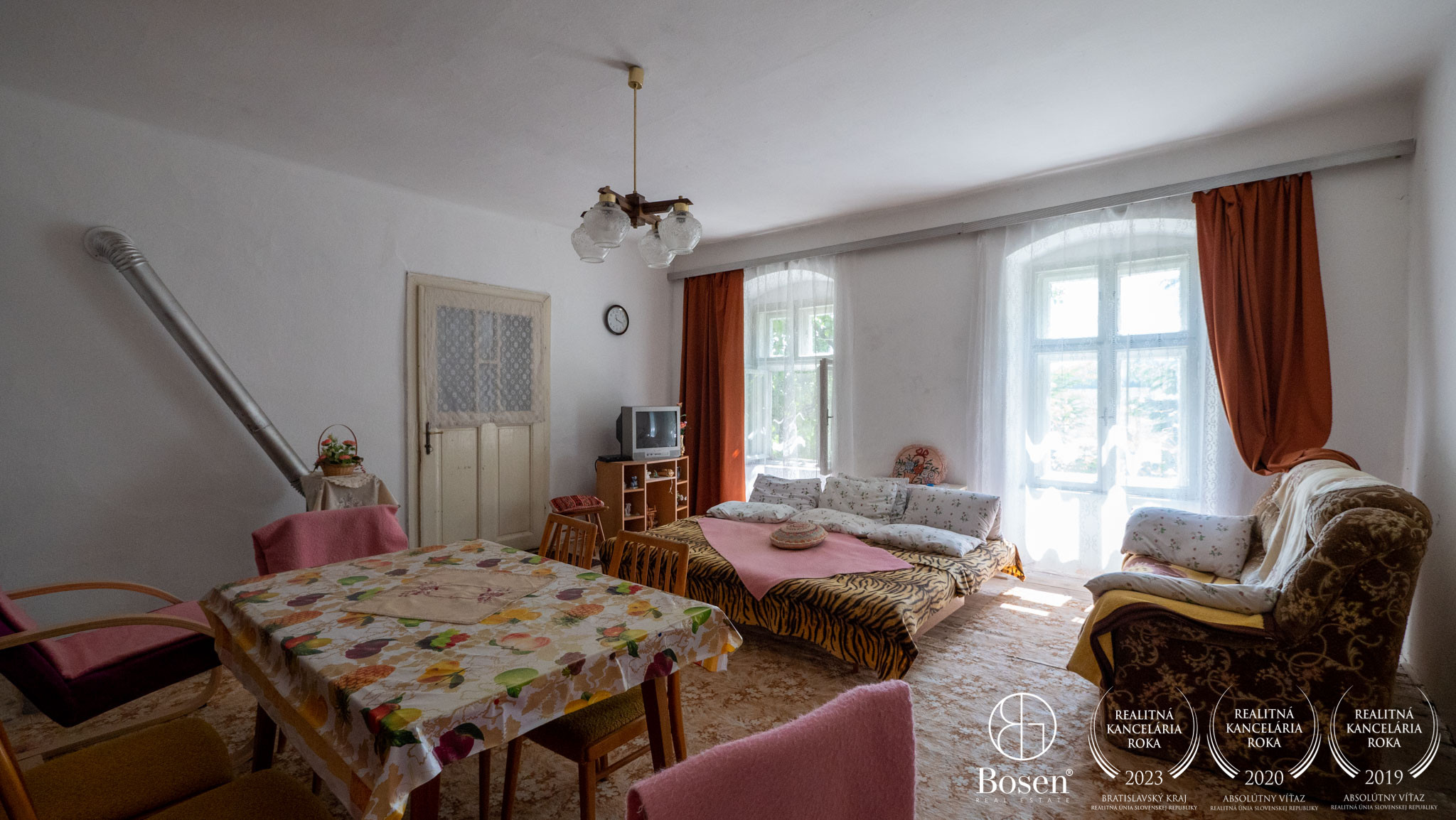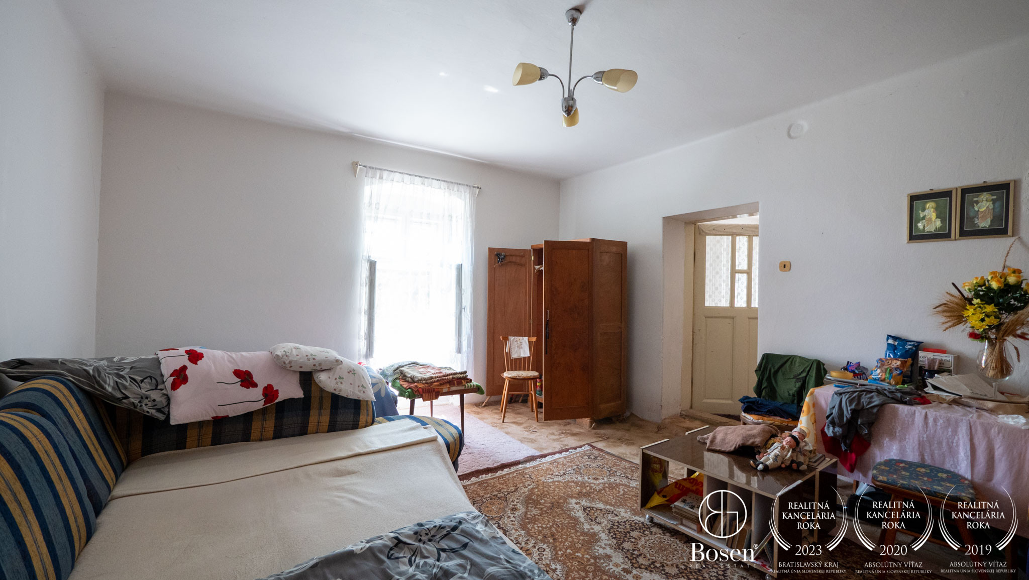 RODINNÝ DOM: pôvodný stav, podlahová plocha je cca. 90 m2, 2 izby, drevené parkety, drevené okná, plynové kúrenie (gamaty), piecka, suché WC, elektrická a plynová prípojka, studničná voda, možnosť obytného podkrovia.