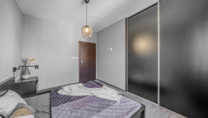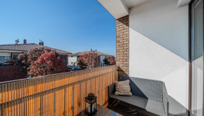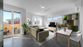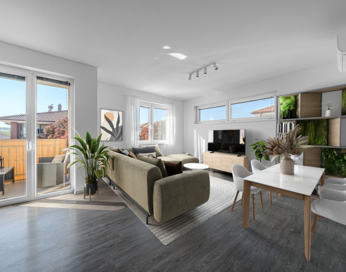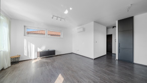 Dispozícia: Vstup do domu tvorí chodba so schodiskom na prvé poschodie, kde je vstup do bytu. Na schodisku je úložný odkladací priestor. Vstup bytu tvorí priestranná chodba, ktorej je vstup do jednotlivých miestností. Na začiatku je spálňa so vstavaným rolldorom, detská izba s priestorom na šatník. Kúpeľňa je priestranná s vaňou a samostatným WC. Kuchyňa je prepojená s obývacou izbou. Z kuchyne je vstup na balkón. V obývačke je klimatizácia.