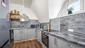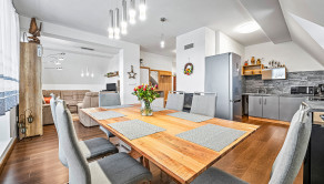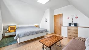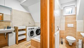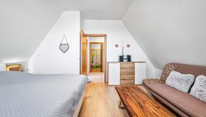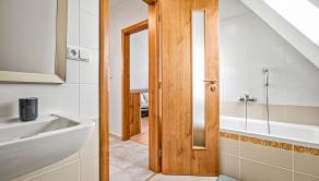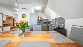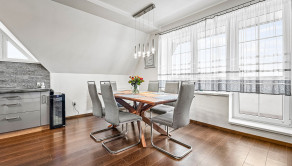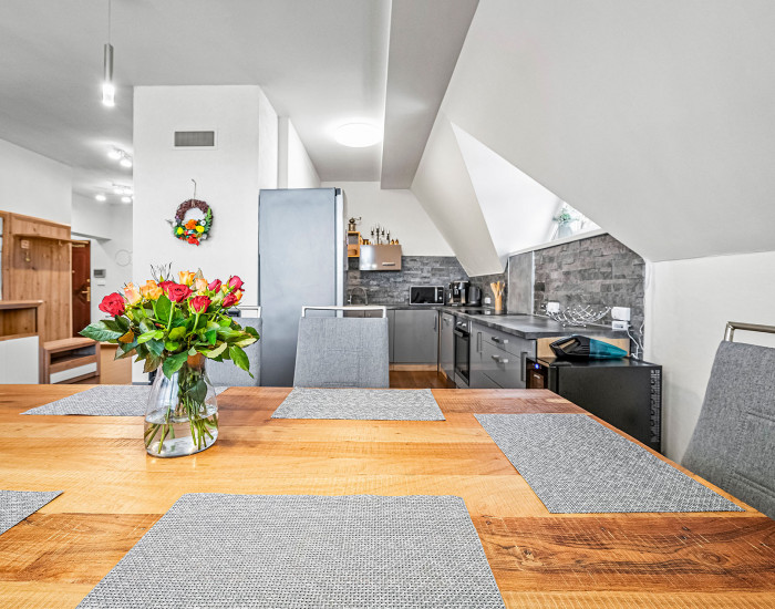 APARTMÁN: Celková výmera apartmánu je 132,45 m2 vstup do apartmánu sa nachádza na 2 podlaží apartmánového domu bez výťahu. Apartmán disponuje 2 balkónmi orientovanými na východ, tiež pivnicou na prízemí. Na 1 podlaží apartmánu sa nachádza priestranná kuchyňa s jedálňou prepojená s obývacou izbou, jedna spálňa, kúpeľňa a samostatné WC. V podkroví sa nachádzajú dve spálne, kúpeľňa s WC. K apartmánu prislúcha aj podiel na spoločných častiach domu, kde patrí aj priestranná záhrada, altánok s možnosťou grilovania a posedení, ktorý je kompletne oplotení a využívaný len vlastníkmi nehnuteľností.