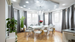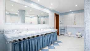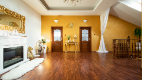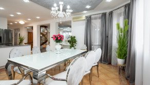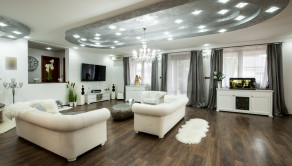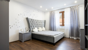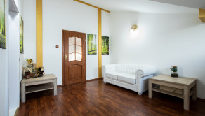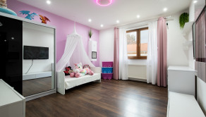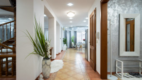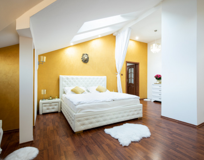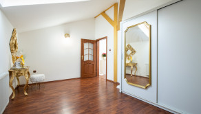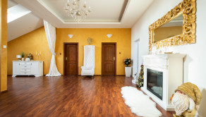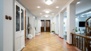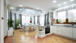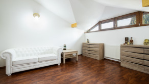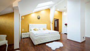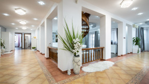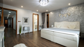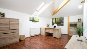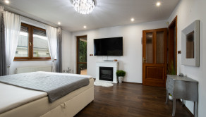 DISPOZÍCIA: Interiér domu tvorí vstupná chodba a samostatná toaleta. Priestrannú dennú časť domu predstavuje kuchyňa s jedálňou, obrovská obývacia izba s výstupom na terasu, technická miestnosť. Cez priestrannú chodbu sa dostaneme do časti, kde sa nachádzajú: Spálňa s kúpeľňou a šatňou, 2 detské izby, hosťovská izba sklady a kúpeľňa pre 5 osôb. Dom disponuje na poschodí obrovskou halou, nachádza sa tu ďalej: miestnosť ideálna pre HOME OFFICE so zasadačkou, spálňa so šatníkom, miestnosť pre Wellness (fitness, sauna, vírivka). Na poschodí sú dve miestnosti, ktoré nie sú dokončené: kúpeľňa, detská-,hracia miestnosť. Súčasťou domu je aj dvoj garáž a samostatne stojaca garáž.