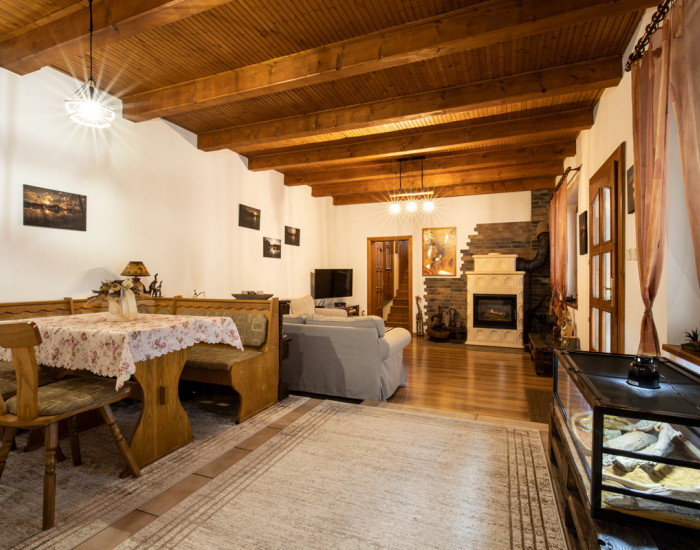 RODINNÝ DOM: Úžitková plocha tejto nehnuteľnosti je 140m2. Vchod do domu je od dvora cez priestrannú terasu s posedením. Z predsiene sa dostanete do šatníka/technickej miestnosti, z ktorého je aj výstup na povalu. Ďalej sa dostanete do kúpeľne, a veľkej otvorenej miestnosti, kde je kuchyňa špajzou a veľká obývacia miestnosť. Dom má dve samostatné spálne, z ktorých je jedna na poschodí.