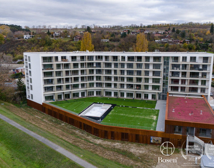 VYBAVENIE: Byt je vybavený bezpečnostnými vchodovými dverami, hliníkovými oknami a balkónovými dverami s izolačným trojsklom a predprípravou na exteriérové žalúzie. Obytné miestnosti majú kvalitné laminátové podlahy. Kuchyne a kúpeľne sú vybavené keramickou dlažbou. V byte je podlahové vykurovanie a predpríprava na klimatizáciu. Objekt má centrálnu kotolňu. Každý byt má prístup k optickému internetu. Komplex disponuje vlastným exteriérovým bazénom.