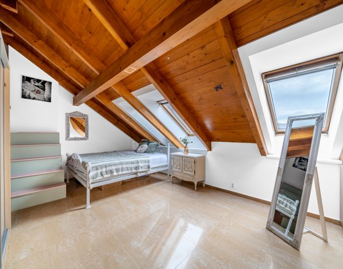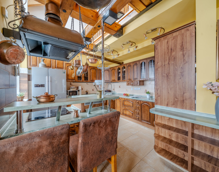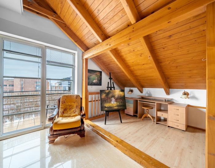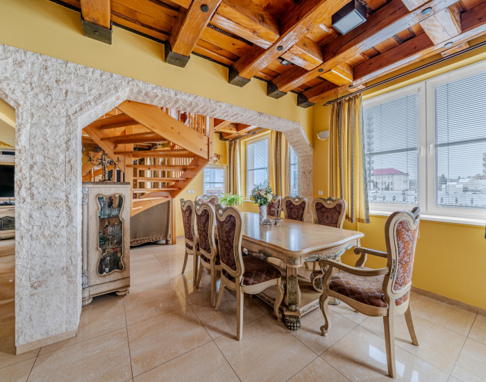 DISPOZÍCIA: Dispozíciu bytu tvoria štyri obytné miestnosti s príslušenstvom. V priestoroch vstupného podlažia sa nachádza vstupná predsieň (podlaha z gresovej dlažby, časť stien je opatrená obkladom z kameňa), technická miestnosť, chodba, WC, kúpeľňa, pracovňa, obývacia izba s jedálňou a masívnym dreveným schodiskom do podkrovného podlažia, kuchyňa a jedna izba (spálňa). Z miestností na podlaží sú prístupné dva balkóny a dve terasy. V priestoroch podkrovného podlažia sa nachádza galéria so schodiskom, šatník, kúpeľňa a dve izby (spálne). Z priestorov v podkrovnom podlaží je prístupný jeden balkón. V podzemnom podlaží budovy sa nachádza pivnica (príslušenstvo bytu). Okná obytných miestností bytu sú orientované na severozápad, juhozápad a juhovýchod.