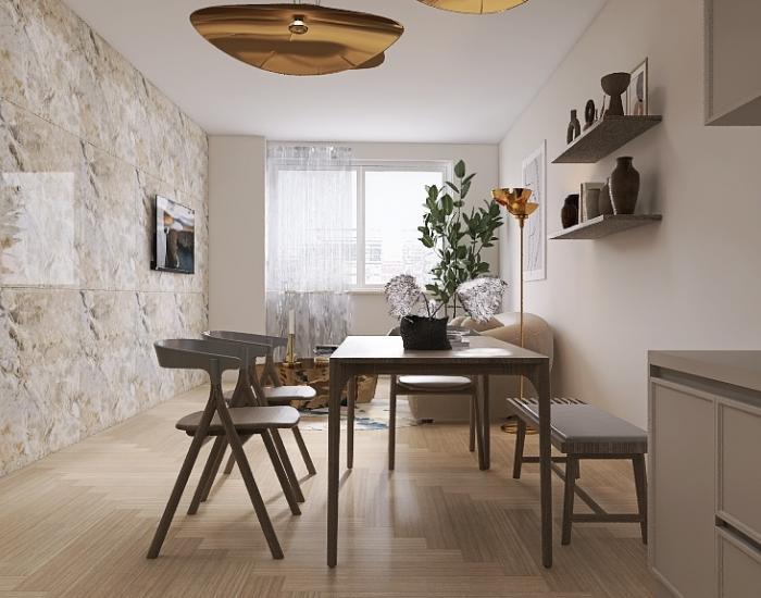 BYT: Celková plocha bytu je 43.36 m2 z toho je výmera pivničnej kobky 2.13 m2. Nachádza sa na 2./4. poschodí s výťahom. Byt má premyslenú dispozíciu, vrámci ktorej je možné vytvoriť oddelený spací kút v rozmere až 7.59 m2.