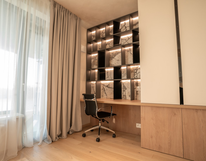 DISPOZÍCIA A ZARIADENIE: Byt je výborne dispozične riešený – pozostáva z priestrannej vstupnej predsiene, otvorenej obývacej izby spojenej s plne vybavenou kuchyňou a jedálenským kútom, dvoch samostatných izieb, kúpeľne s vaňou, druhej kúpeľne so sprchovým kútom, samostatného WC, šatníka a chodby. Loggia je prístupná z troch miestností – obývacej izby, hlavnej spálne a druhej izby – a poskytuje nádherný výhľad na rieku Dunaj a promenádu v Eurovei. Byt je kompletne zariadený dizajnovým nábytkom na mieru, vrátane pohodlnej sedacej súpravy, jedálenského stola, vstavaných skríň a úložných riešení. Kuchyňa je vybavená kvalitnými spotrebičmi vrátane indukčnej varnej dosky, rúry, umývačky riadu a chladničky s mrazničkou. K štandardu patrí aj klimatizácia, podlahové kúrenie, drevené podlahy a moderné ambientné osvetlenie.