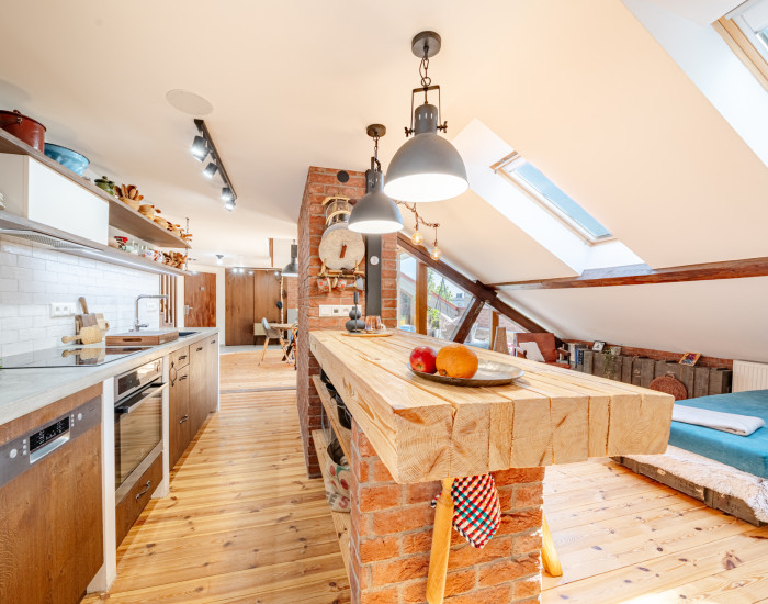 Bosen Group offers for sale a 4-room duplex apartment with a unique spirit. The apartment stands out thanks to a complete renovation, personally supervised by the owners, resulting in an original living space where wood is the predominant material. The apartment features a terrace with an exceptional view of Bratislava Castle. The property is located in the Old Town on Kozia Street.