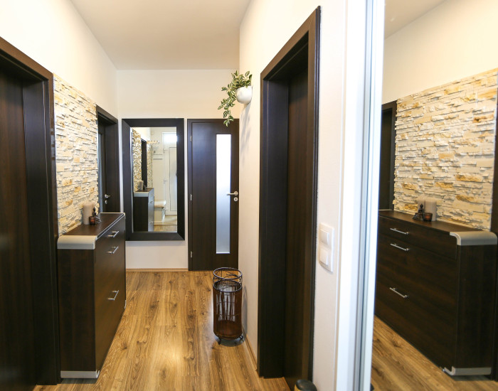 ZARIADENIE: Rodinný dom disponuje podlahovým kúrením, samostatne nastaviteľnými termostatmi v každej izbe, príprava TÚV je zabezpečená elektrickým kotlom. Podlahové vykurovanie je v obývacej izbe doplnené o krbové teleso s teplovzdušnou vykurovacou vložkou. Chladenie zabezpečujú dve klimatizačné jednotky. Vo všetkých obytných miestnostiach sú laminátové podlahy, v kúpeľni je keramická dlažba. Okenné výplne, vrátane vchodových dverí a vonkajších dverí na terasu, sú atypické plastové, zasklené izolačným trojsklom. V kuchyni sa nachádza kuchynská linka so zabudovanými elektrospotrebičmi (elektrická varná doska, teplovzdušná elektrická rúra, umývačka riadu, odsávač pár, mikrovlnná rúra, chladnička s mrazničkou) a s granitovým drezom s odkladacou plochou. V rodinnom dome sú štyri priestranné, vstavané skrine.